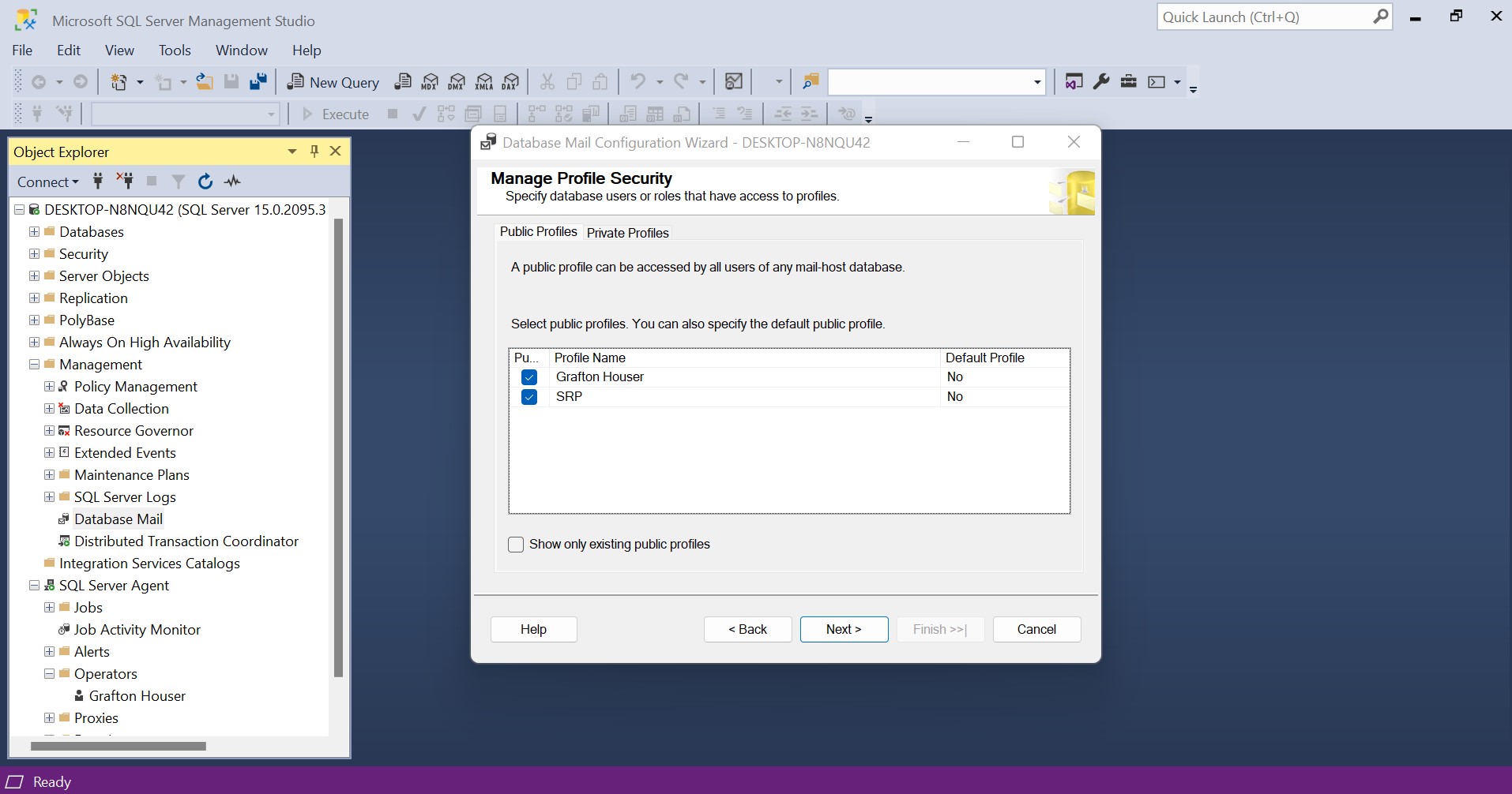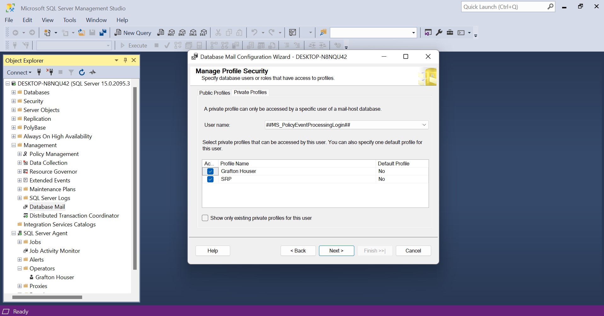 On the Manage Profile Security page, there are two tabs Public Profiles and Private Profiles. In the Public Profiles tab, we configure the account that will be available to any user or role with access to mail host database (msdb) to send email notifcations using that profile. In Private Profiles tab, we select the users and which profiles they can use. For this demo we will only be selecting the profile "SRP" and "Grafton Houser under Public and Private DProfiles. Then select Next.