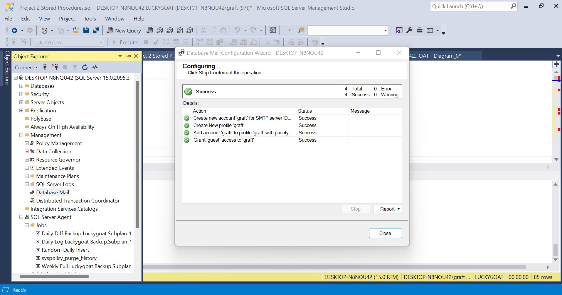 Finally, finish the configuration and the Wizard will complete. Select close and now there is a profile for Database Mail.