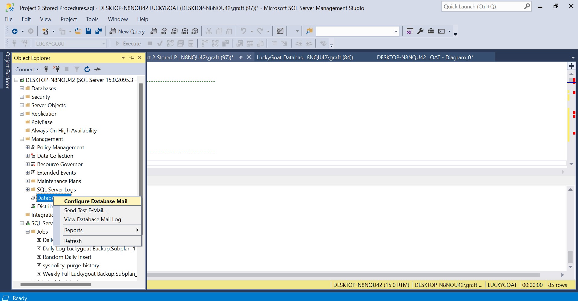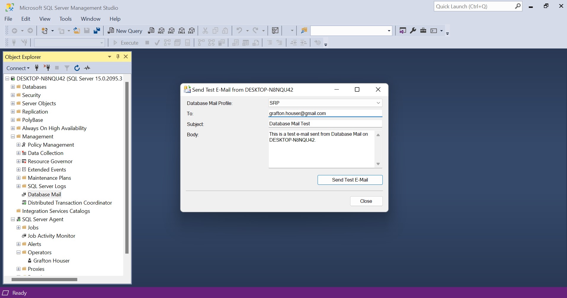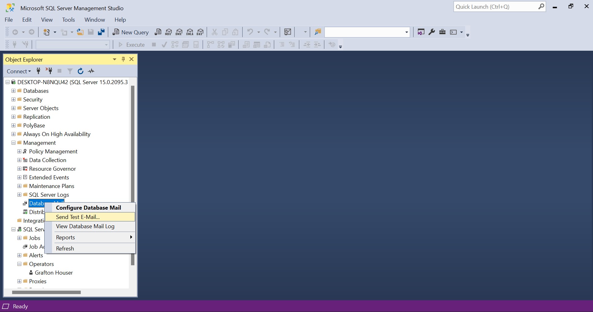 To make sure that the Database email system was properly set up, right click again on Database Mail in the Object Explorer and select Send Test Email