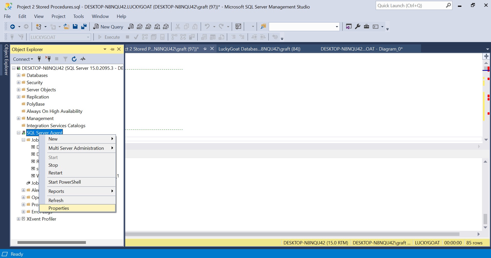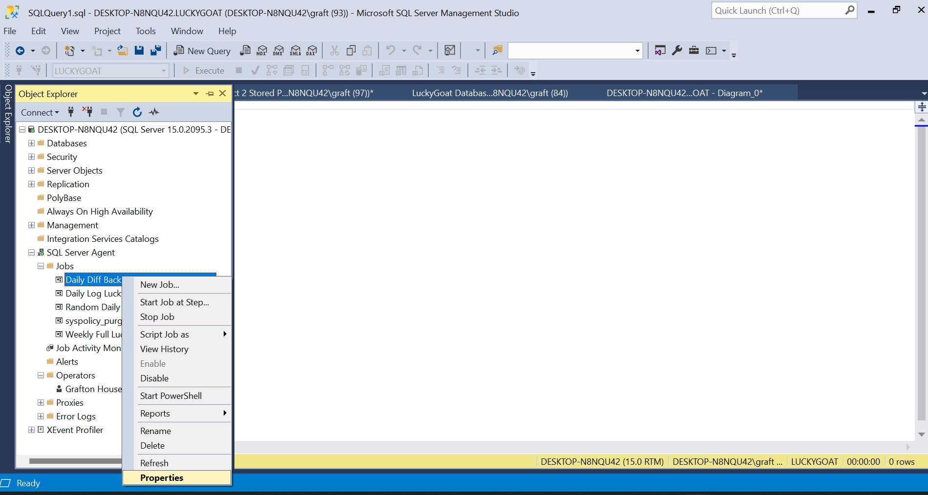 First locate the Jobs tab under SQL Server Agent in the Object Explorer and right click on the job that we want email notifications for and select Properties. In this demo we will be selecting the Daily Differential Backup Job.