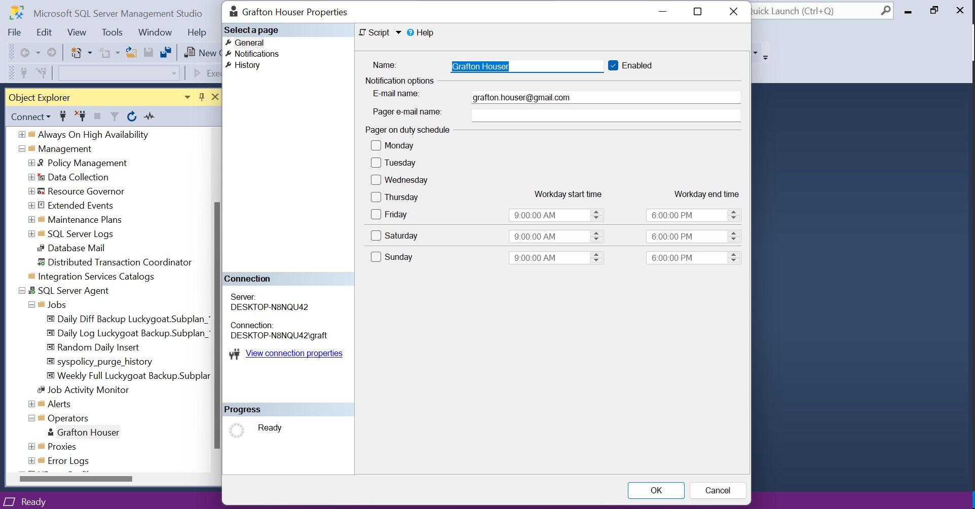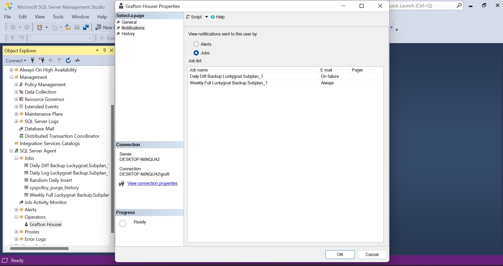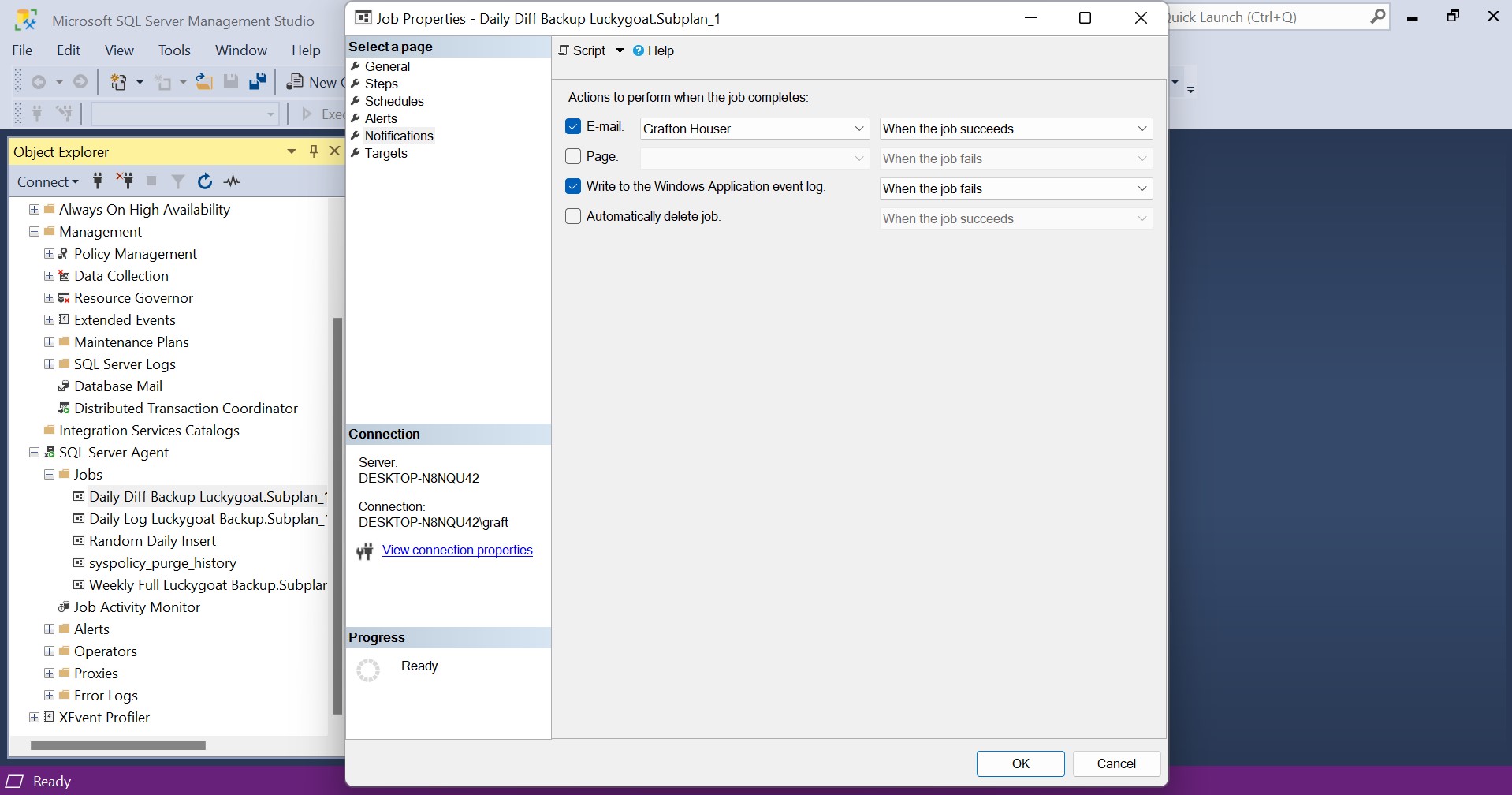 For any backup job, it is wise to be notified as soon as possible if the job fails. Thus, go back to your Jobs under SQL Server Agent and customize the notifications to notify the operator whenever the backup job fails.