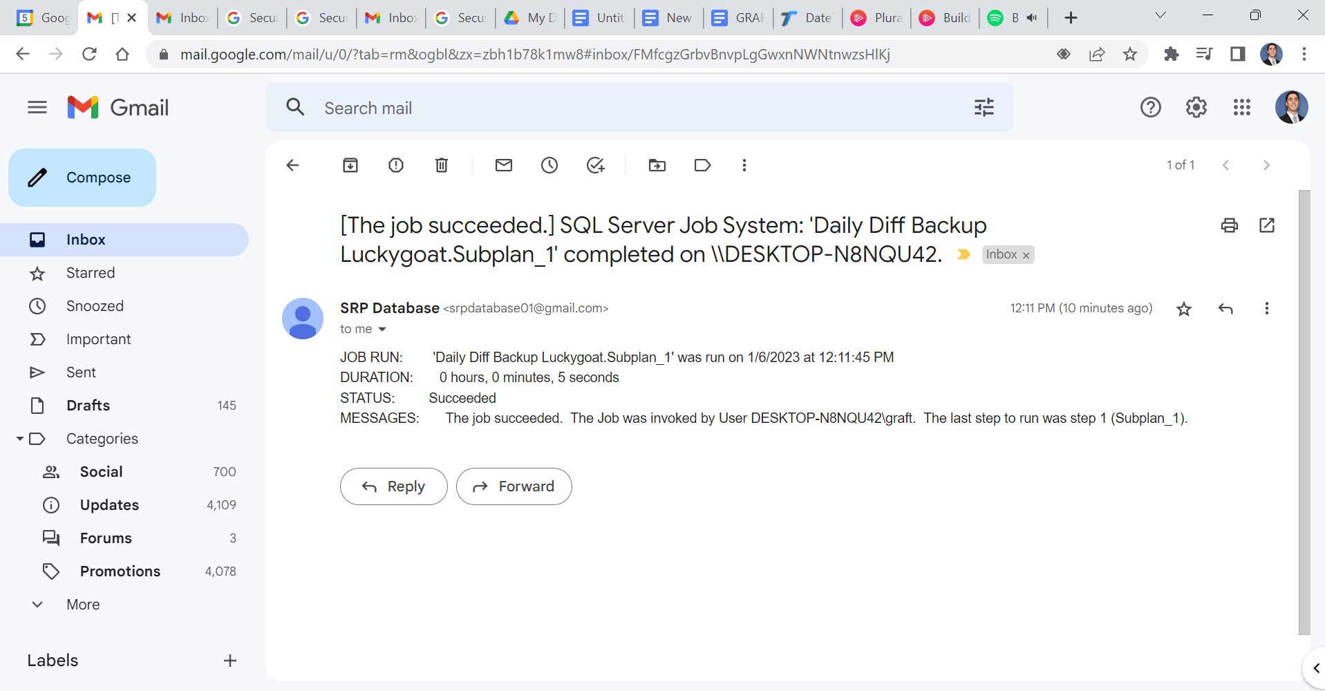 For this demo, we chose to notify the Operator when the job succeeds, just to prove that the system works. After we ran the daily differential backup that we created a job notifcation for. We received this notication showing us that it worked successfully.